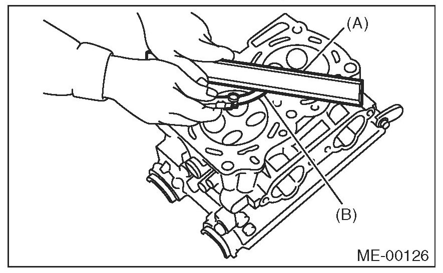 2) Measure the warping of the cylinder head surface that mates with cylinder block using a straight edge (A) and thickness gauge (B).