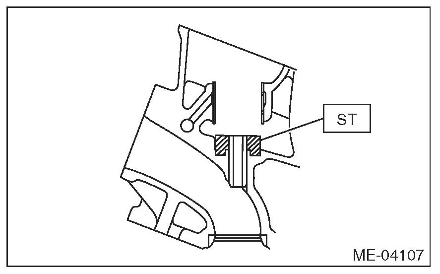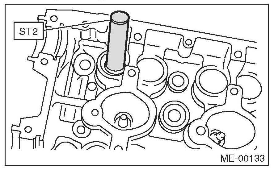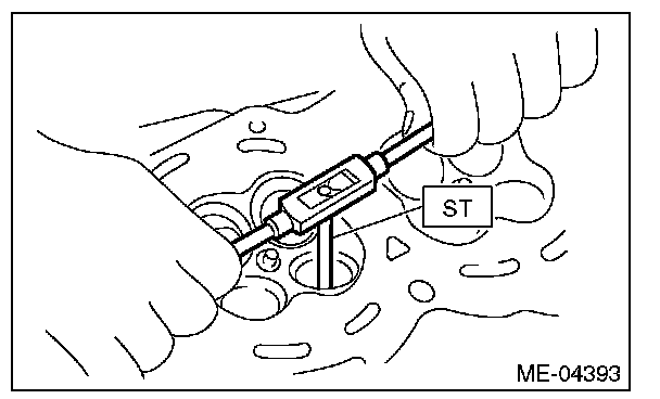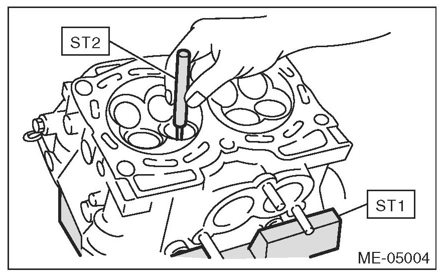 (5) Put a new valve guide, coated with sufficient oil, in the cylinder head, and insert the ST1 into valve guide. Press in until the valve guide upper end is flush with the upper surface of ST2.
