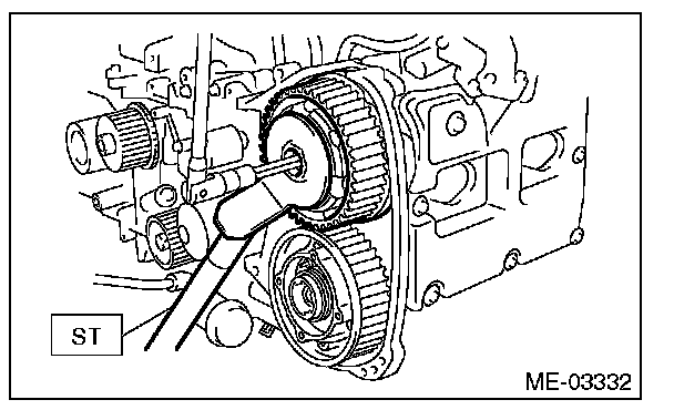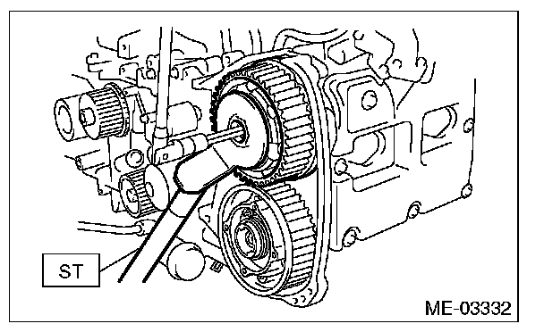 5) Use the ST to lock the cam sprocket, and remove the cam sprocket bolt.