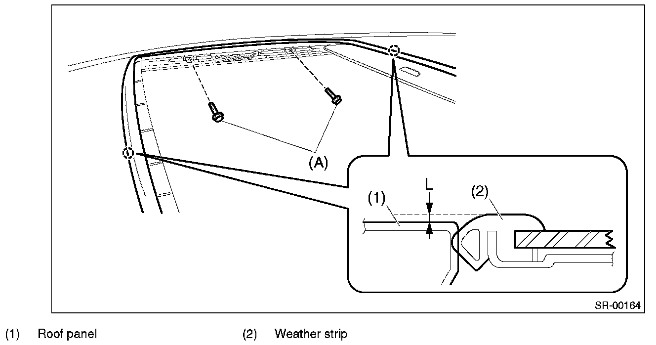 Difference in height between weather strip and roof panel L: 0 ±1.0 mm (0 ±0.04 in)