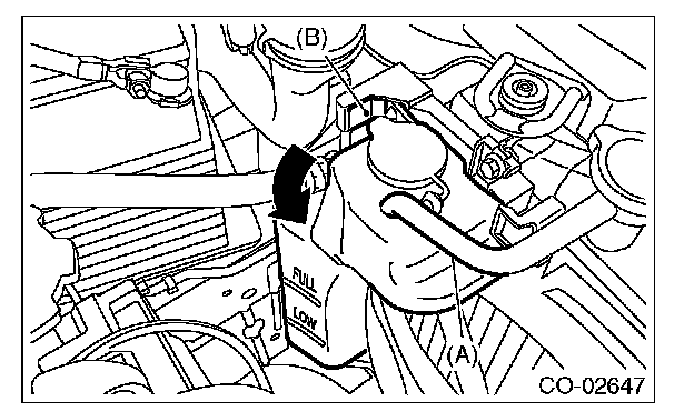 2) Pull out the reservoir tank to the arrow direction while pushing the claw (B).