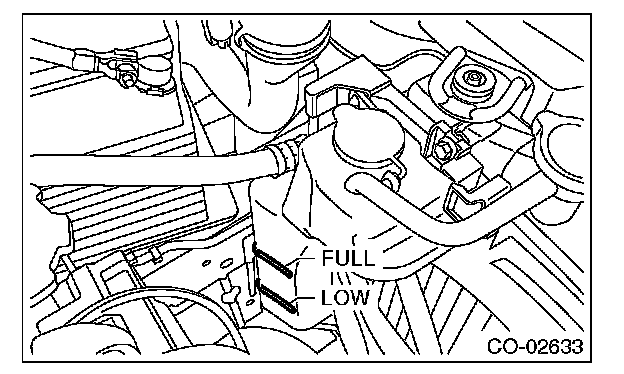 3) Make sure the engine coolant level is between "FULL" and "LOW".