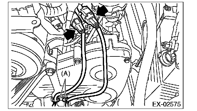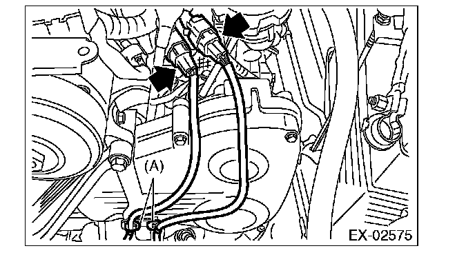 3) Disconnect connectors from the front oxygen (A/F) sensor and rear oxygen sensor, and remove the clip (A) fastening the front oxygen (A/F) sensor harness and rear oxygen sensor harness.