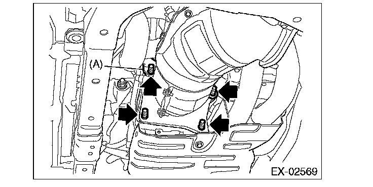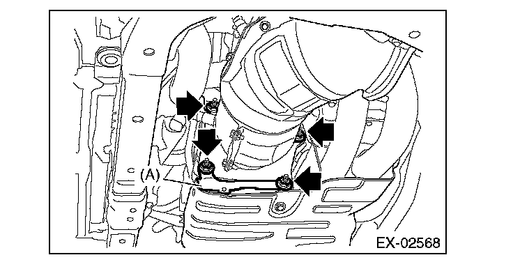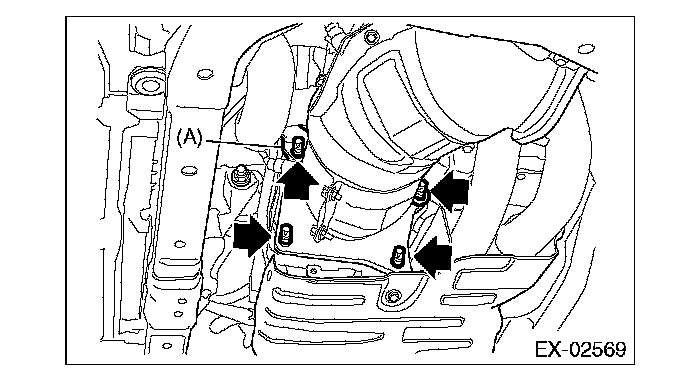 11) Remove nuts which hold center exhaust pipe (front) to the turbocharger, and remove the turbocharger lower stay (A).