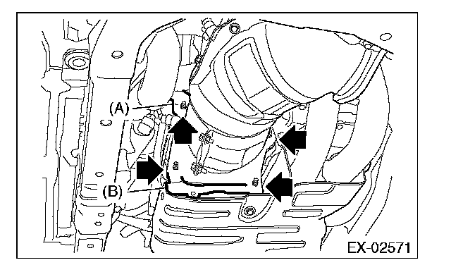 2) Install the center exhaust pipe (front) to the turbocharger together with turbocharger upper stay (A) and turbocharger lower stay (B).