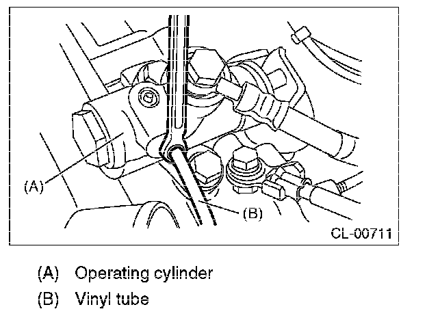 4) Fit one end of a vinyl tube into the air breather of the operating cylinder, and put the other end into a clutch fluid container.