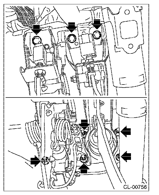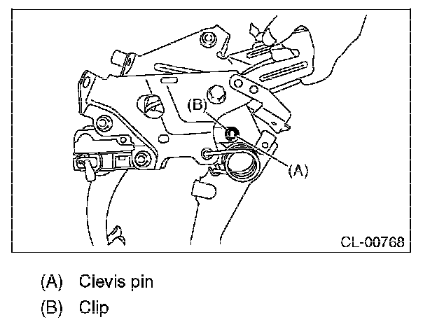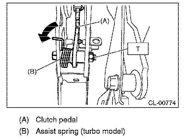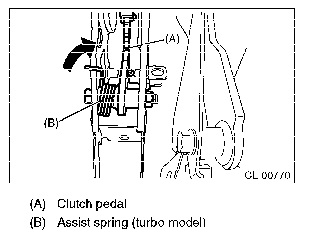 Before removing the clutch pedal mounting bolt, remove the hook of the assist spring from the pedal bracket. (turbo model)