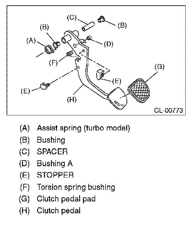 9) Remove the assist spring (turbo model), bushing, spacer, bushing A, stopper, torsion spring bushing and clutch pedal pad from the clutch pedal.