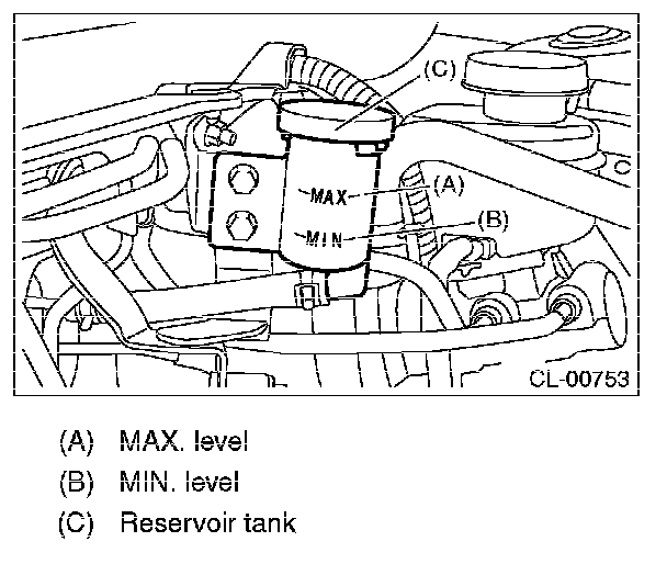 8) Check the clutch fluid level using the scale on the outside of the reservoir tank. If the clutch fluid level is below "MIN", fill the clutch fluid up to "MAX" level.