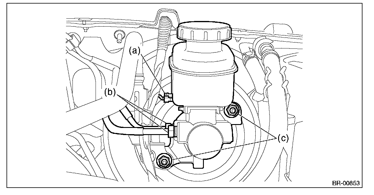 (3) Remove the nut (c), and slowly remove the master cylinder from the brake booster.