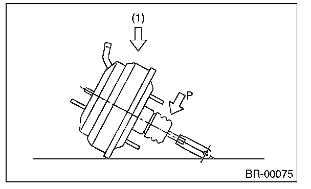 ^ If external force (1) is applied from above when brake booster is placed in this position, the resin portion as indicated by "P" may become damaged.
