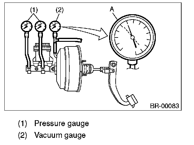 2) Stop the engine and check the gauge. If the vacuum pressure drop within 15 seconds after stopping the engine is 3.3 kPa (25 mmHg, 0.98 inHg) or less, the function of brake booster is normal. If faulty, the cause may be one of the following.