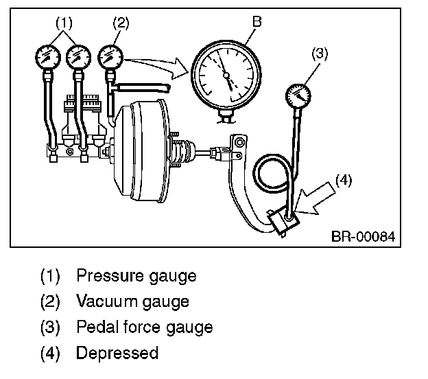 1) Start the engine and depress the brake pedal with a pedal force of 196 N (20 kgf, 44 lbf). Keep the engine running and keep the pedal pressed until a vacuum of point B = 66.7 kPa (500 mmHg, 19.69 inHg) is indicated on the vacuum gauge.
