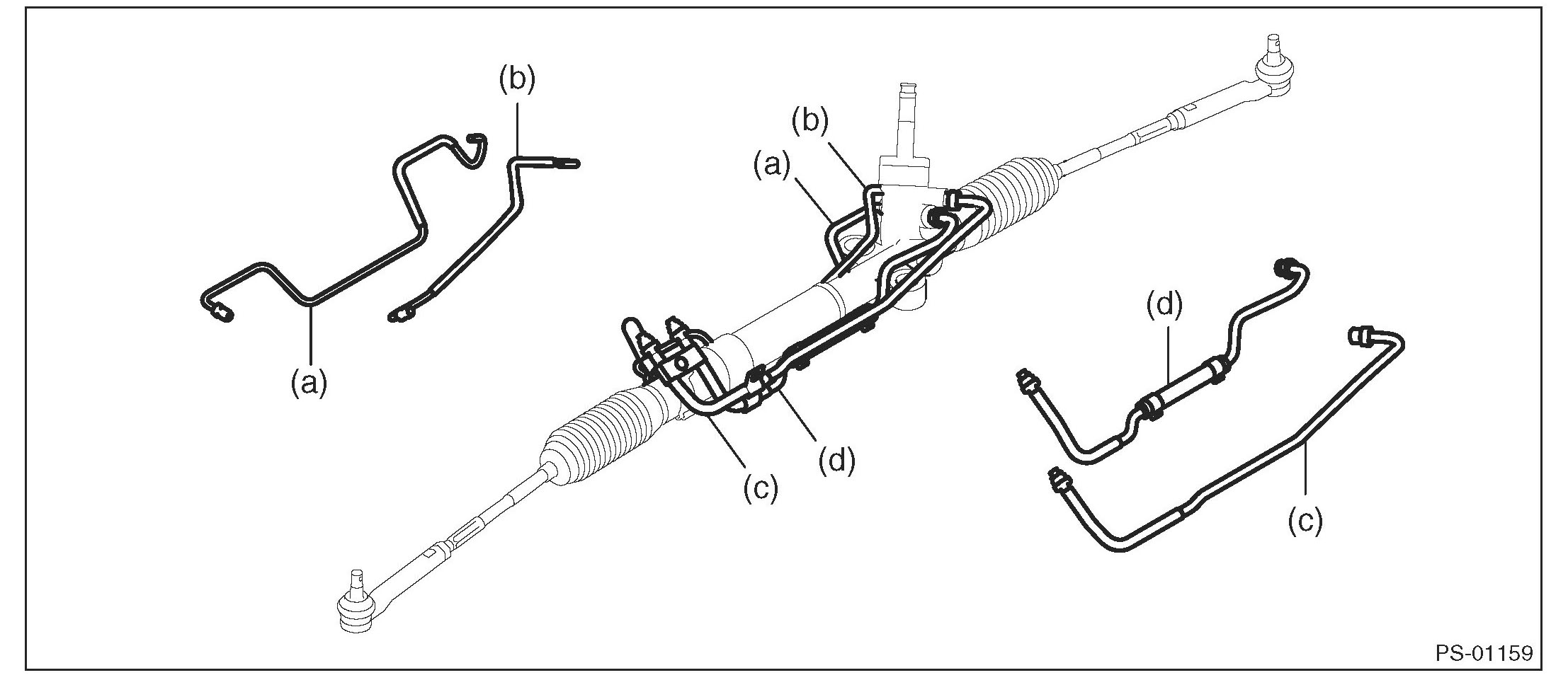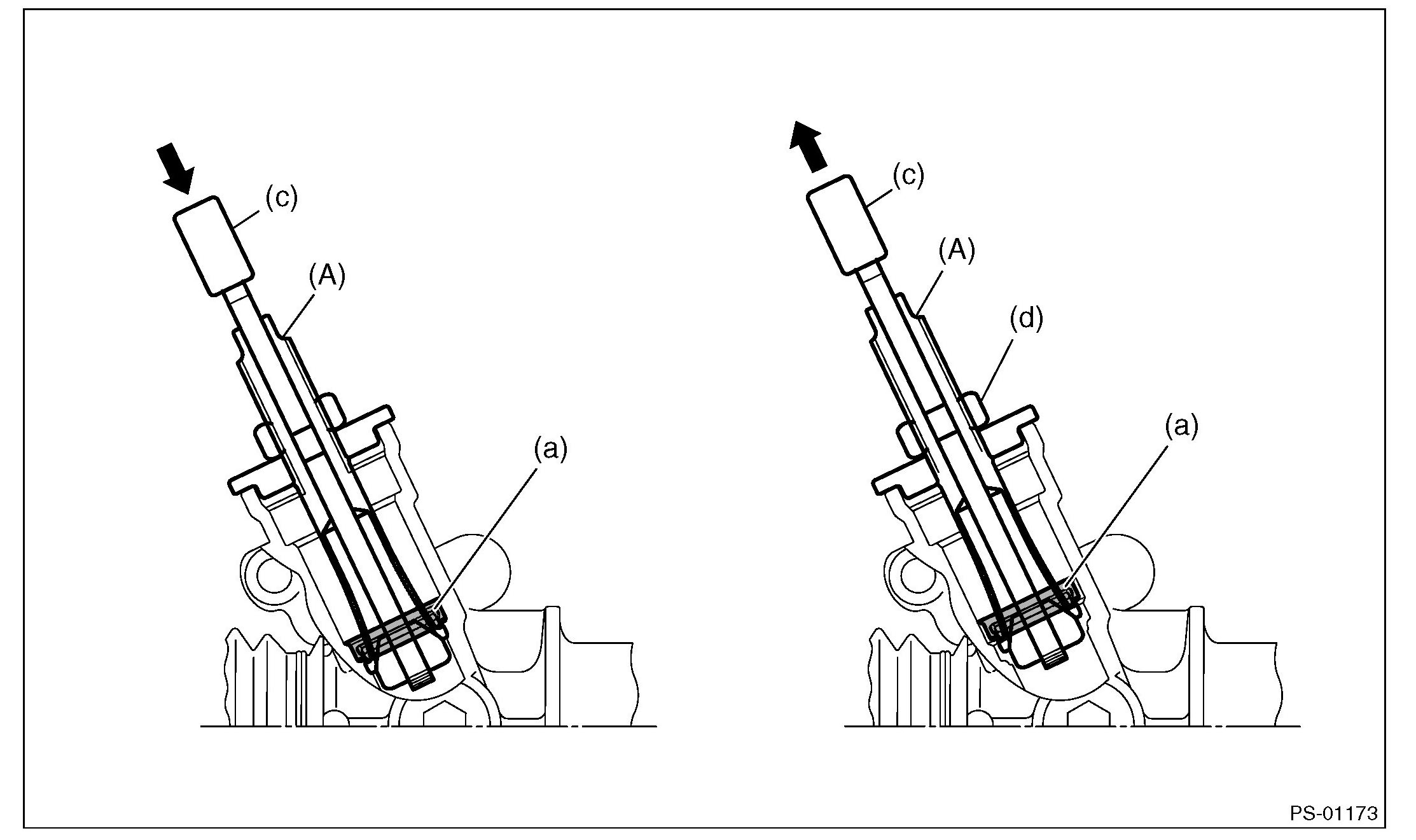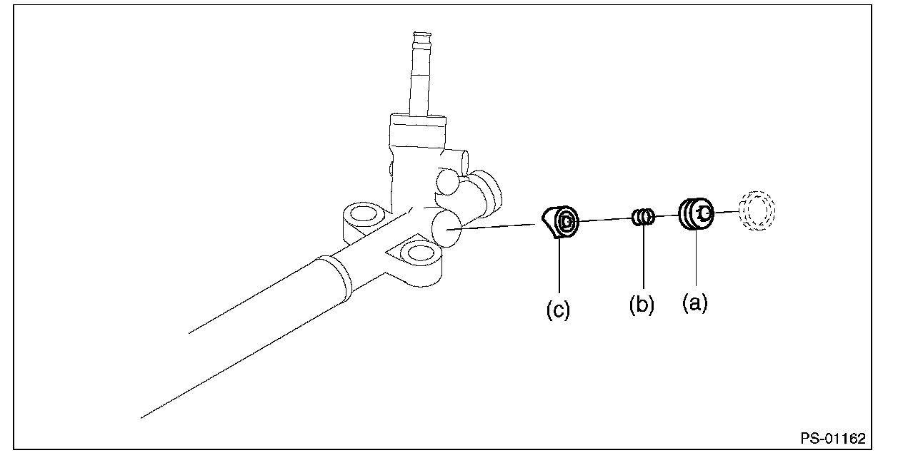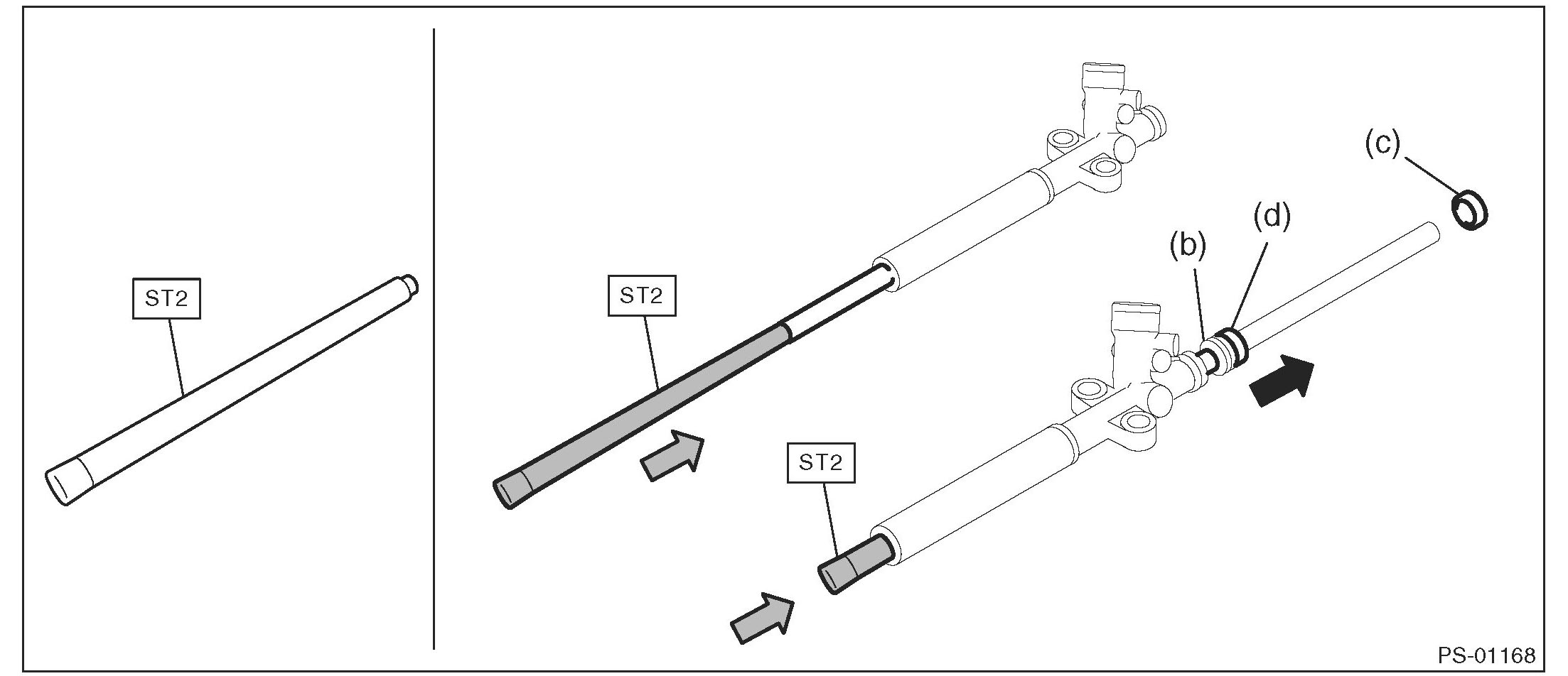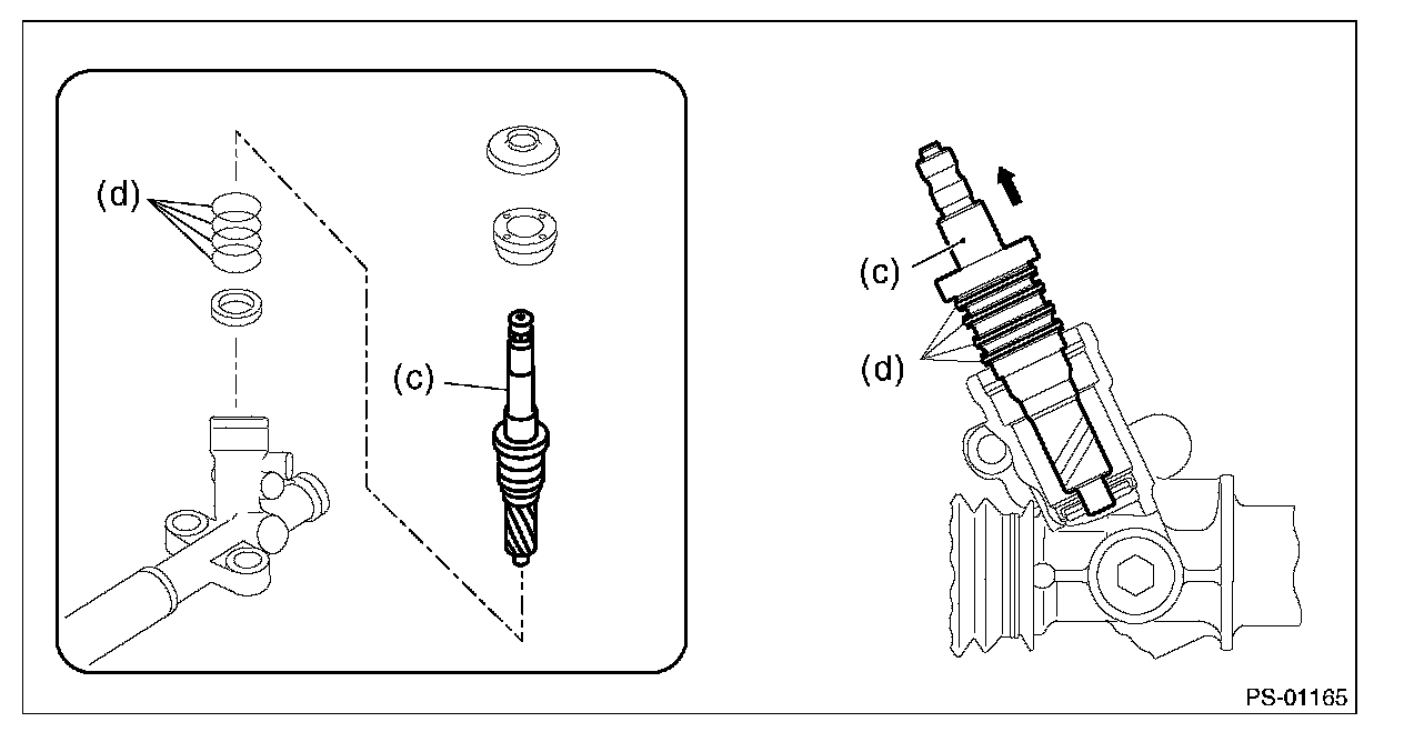 (5) Push the rack in order to push the back-up ring (c) and oil seal (d) out.