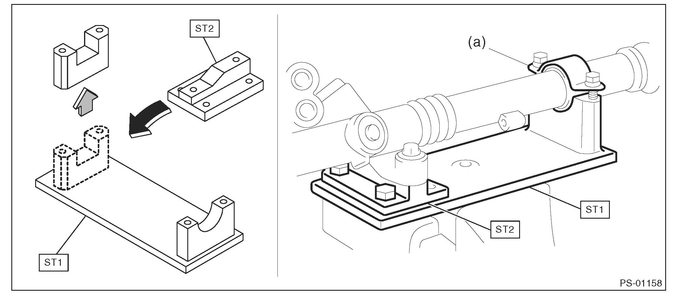 (2) Using the clamp (a) removed from vehicle body, attach the gearbox assembly to ST.