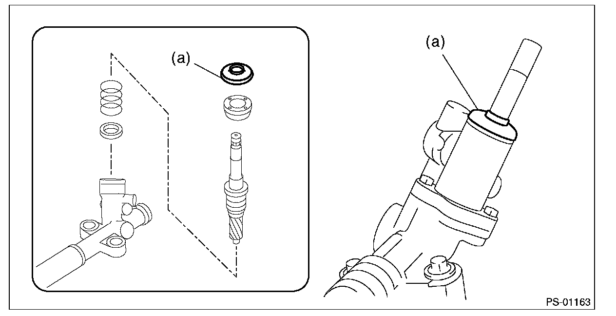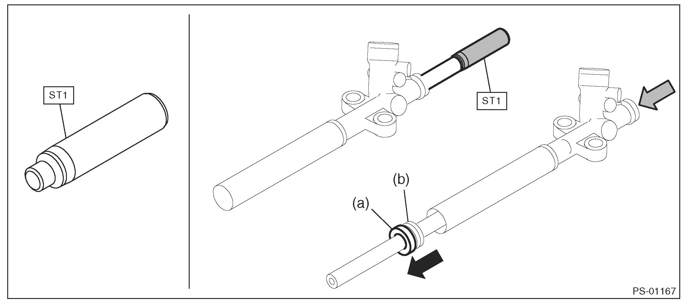 (3) Push the rack so that the rack piston (b) pushes out the outer side oil seal (a) to be removed.