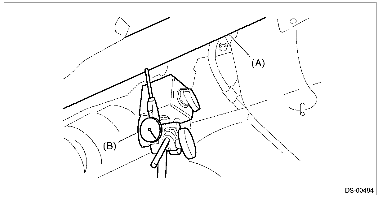 (1) Set the dial gauge (B) with its indicator stem at the center of the propeller shaft (A).