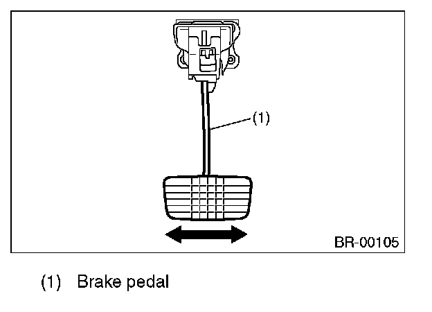 1) Move the brake pedal pads in a horizontal direction with a force of approx. 10 N (1 kgf, 2 lbf), and check that the pedal deflection is in the range of specifications.