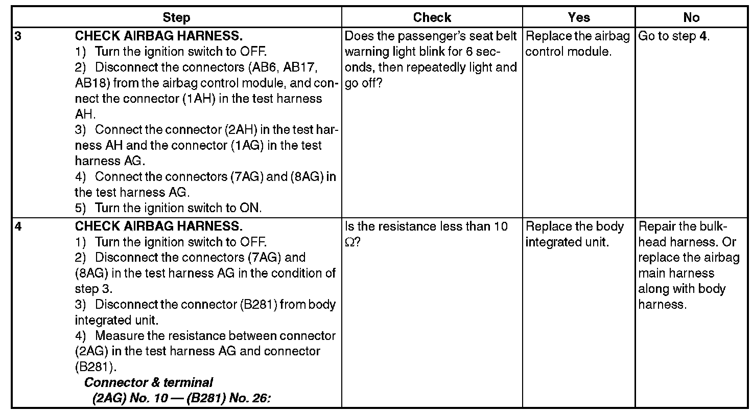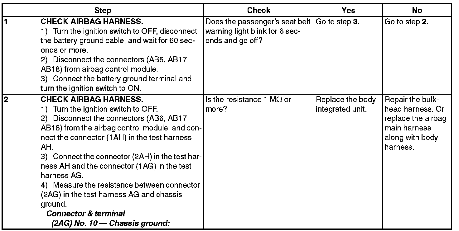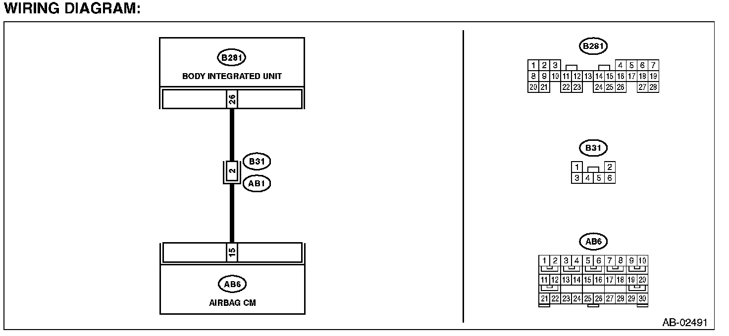 - Harness circuits between body integrated unit and airbag control module are open, shorted or shorted to ground.