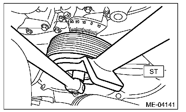 (2) Use the ST1 to lock the crank pulley, and temporarily tighten the crank pulley bolt.