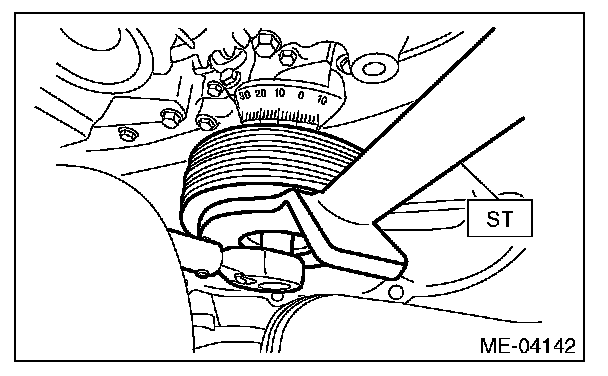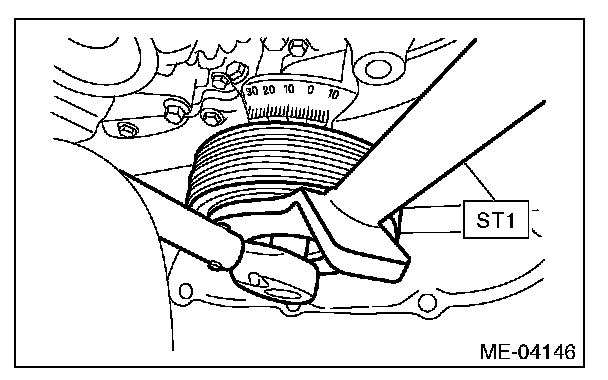 2) Use the ST to lock the crank pulley, and remove the crank pulley bolt.