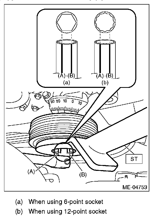 Set the socket onto the crank pulley bolt so that reference lines (A) and (B) is visible.