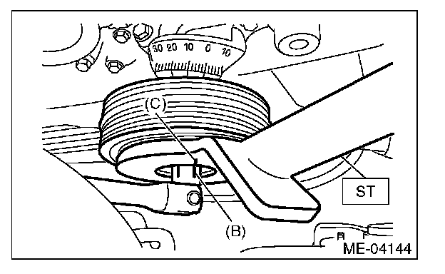 (1) Use the ST to lock the crank pulley, and temporarily tighten the crank pulley bolt.