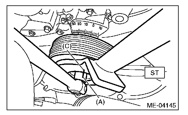 (4) Use the ST to lock the crank pulley, and tighten the crank pulley bolt to the angle where reference line (A) and end line (C) are aligned.
