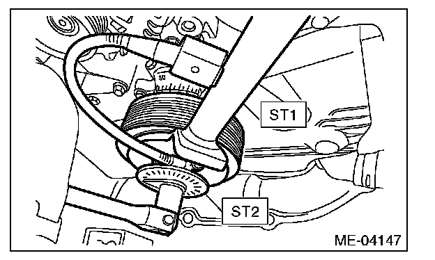 (3) Set the ST2, use the ST1 to lock the crank pulley, and tighten the crank pulley bolt to the specified angle.