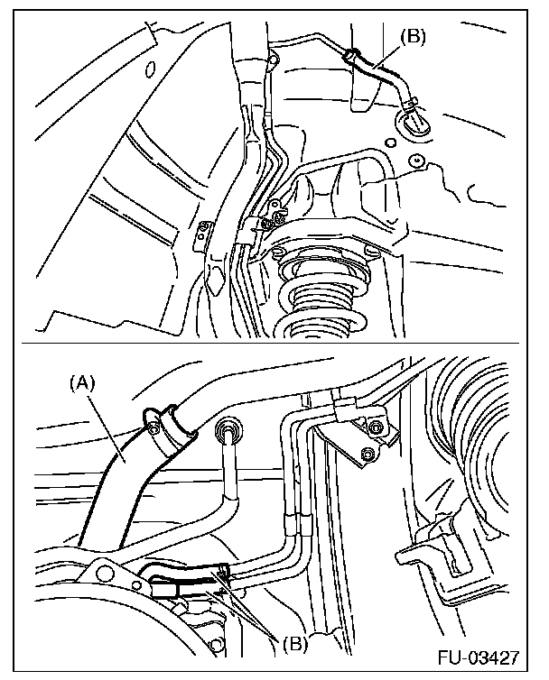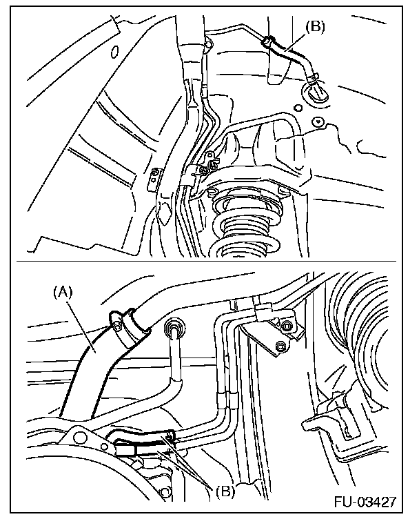 4. Securely insert the fuel filler hose (A) and evaporation hose (B) until the hose end contacts the spool, then attach the clamp or clip as shown in the figure.