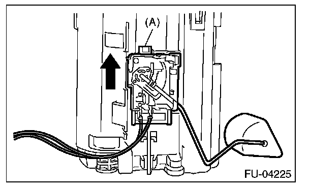 4. Slide the fuel level sensor in the direction of the arrow and remove the fuel level sensor by pressing the claw (A) of the fuel level sensor.