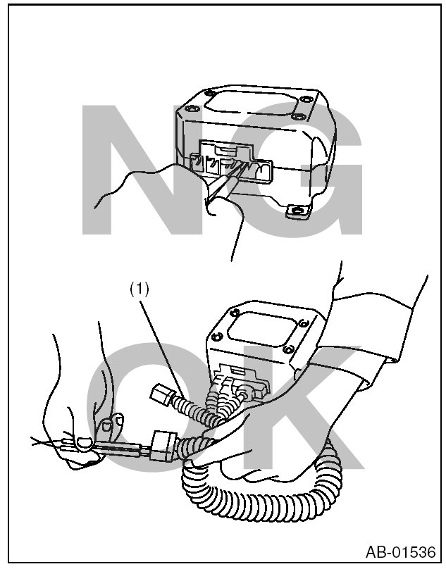 - When checking, use a test harness (1). Damage to connector terminal causes malfunction. Do not directly put the tester probe on airbag connector terminal.