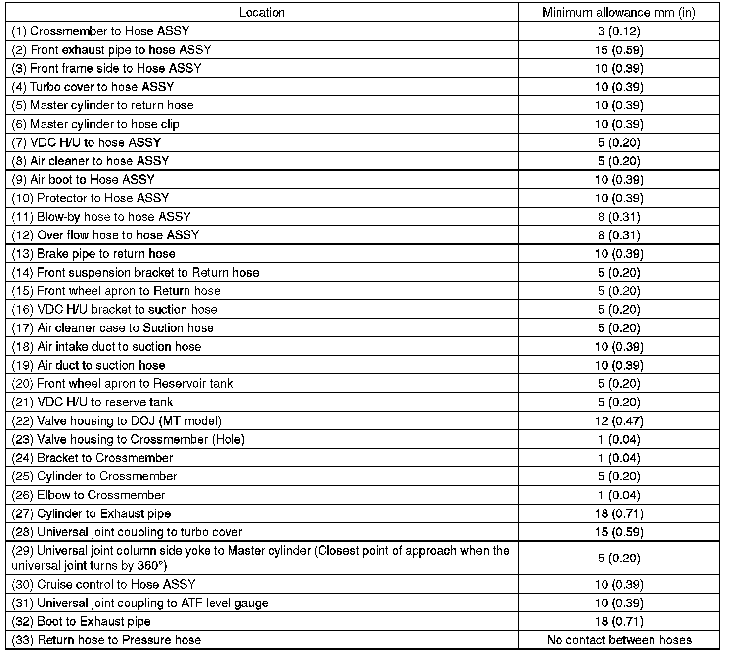 This table lists various clearances that must be correctly adjusted to ensure the normal vehicle driving without interfering noise, or any other faults.