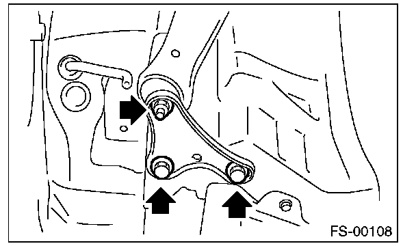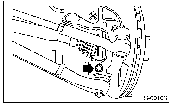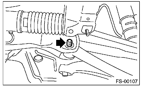 7) Lower the vehicle from lift, and tighten the bolt which secures the front arm to crossmember with wheels in full contact with the ground and the vehicle at curb weight.