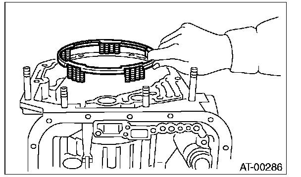 20) Install the 2-4 brake piston spring retainer to the transmission case.