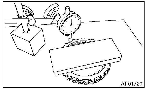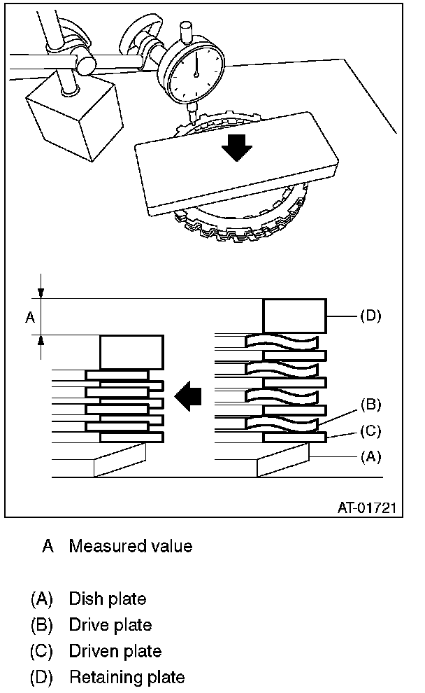 Calculate from the recorded dimension A and B, and if the service limit is exceeded, replace the drive plate with a new part, and select a retaining plate to make an adjustment so that it is within standard.