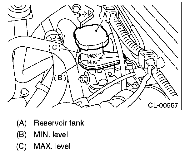 2) Inspect the fluid level using the scale on the outside of the reservoir tank. If the level is below "MIN", add fluid to bring it up to "MAX", and also inspect for leakage.