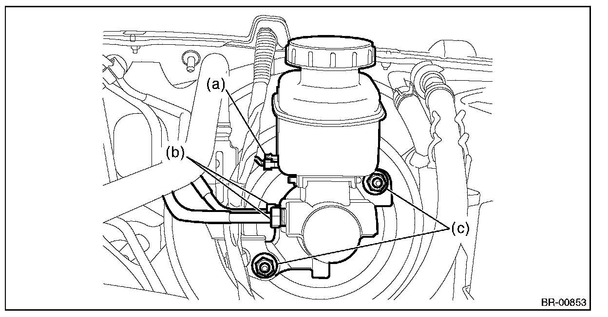(3) Remove the nut (c), and slowly remove the master cylinder from the brake booster.