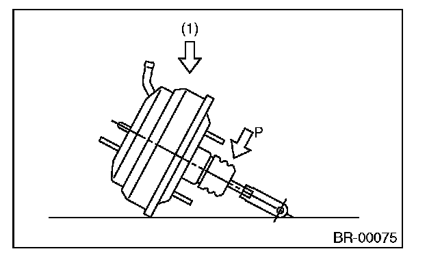 ^ If external force (1) is applied from above when brake booster is placed in this position, the resin portion as indicated by "P" may become damaged.