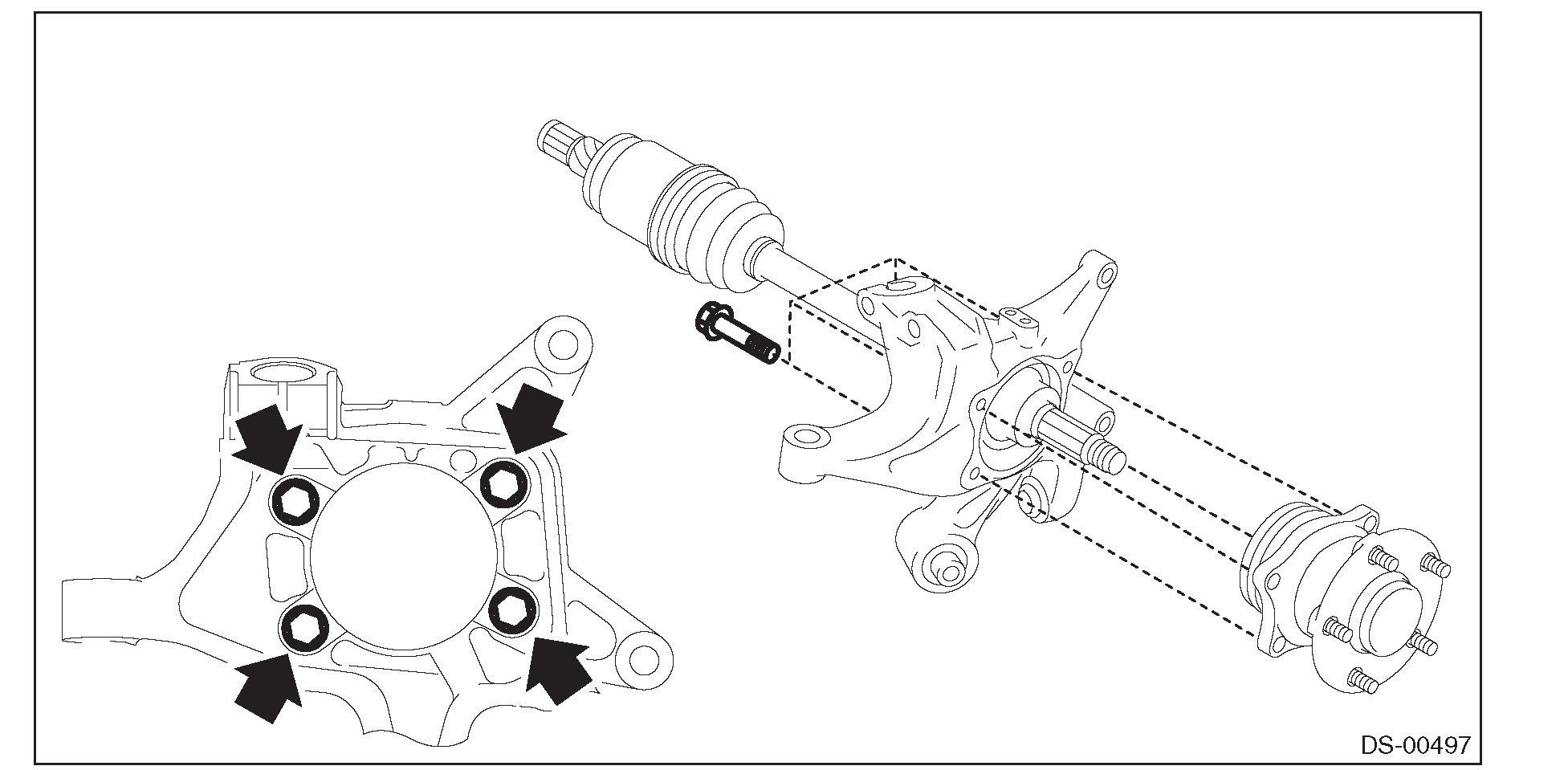 INSTALLATION1) Aligning with the mounting hole of the rear brake back plate, temporarily tighten the rear hub unit bearing to the rear axle housing.
