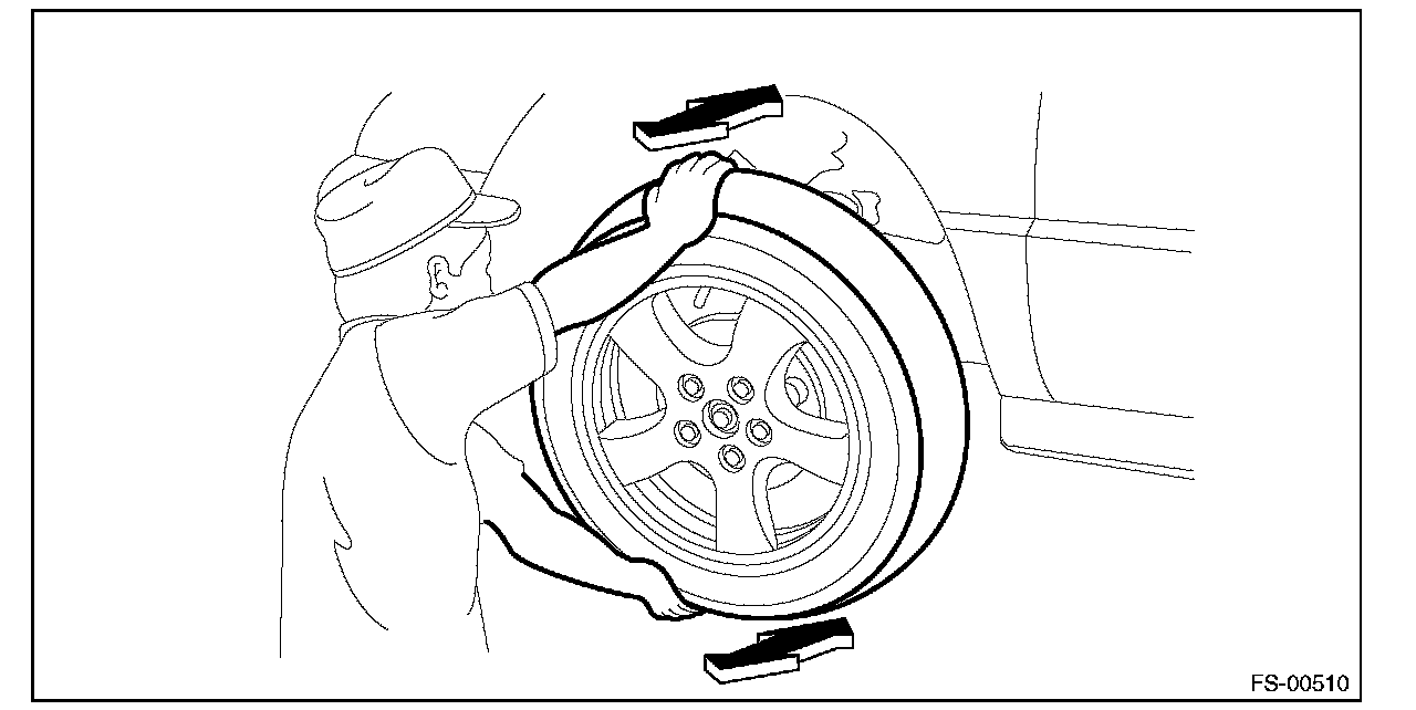 2) Check that there is no play by moving the upper and lower portions of front tire in an axial direction with the brake pedal released.