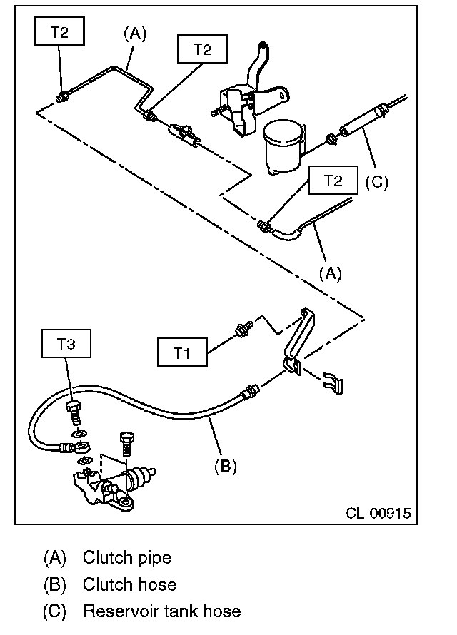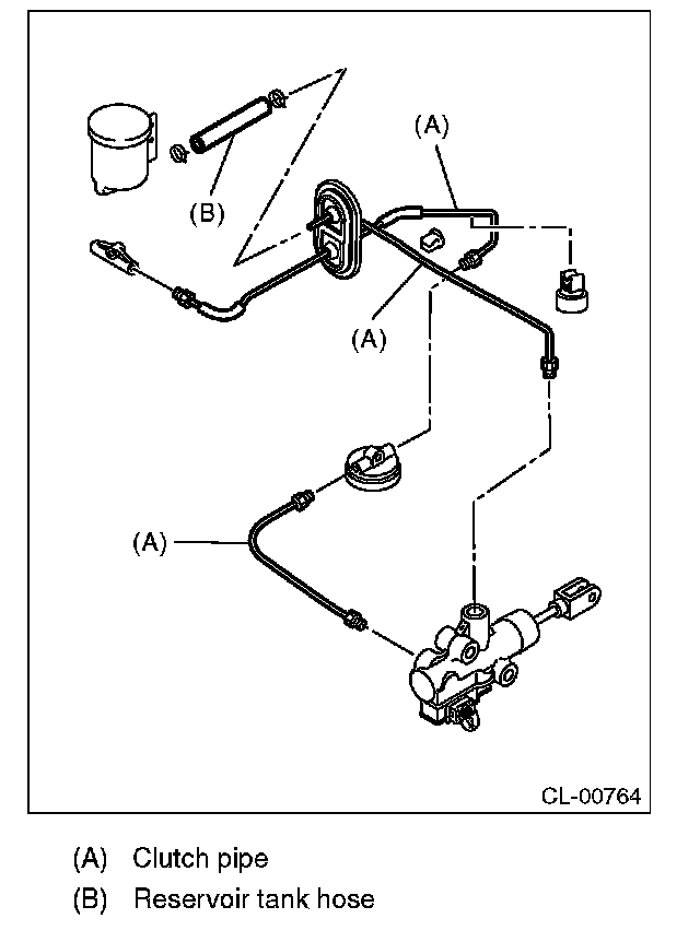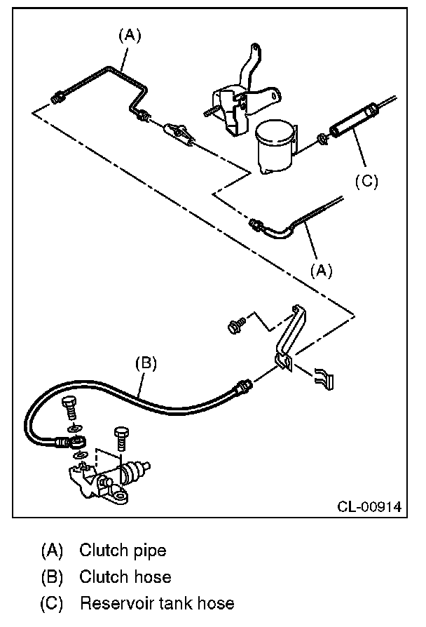 Check the clutch pipe, reservoir tank hose and clutch hose for crack, breaks or damage. Check the joint for clutch fluid leakage. If crack, breakage, damage or leakage is found, repair or replace the faulty clutch pipe, reservoir tank hose or clutch hose.