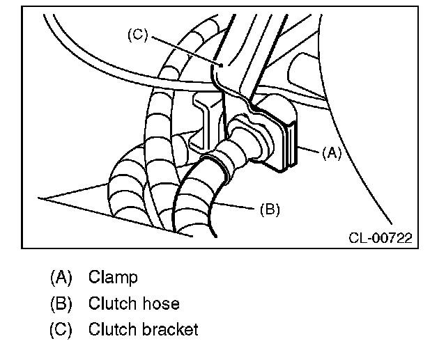 5) Pull out the clamp, then remove the clutch hose from the clutch bracket.