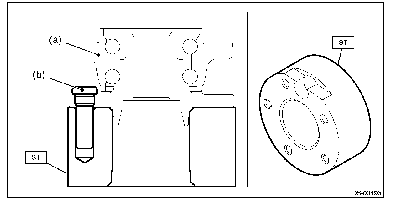 2) Using a press, press the new hub bolts (b) until their seating surfaces contact the hub unit bearing (a).