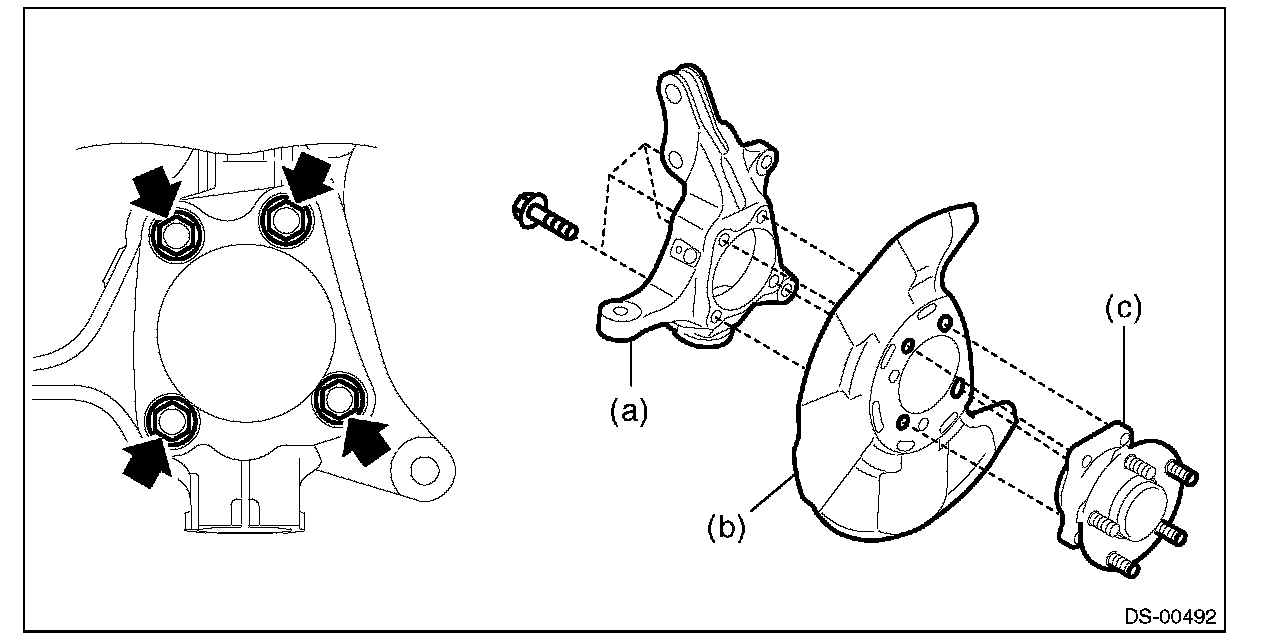 INSTALLATION1) Install the front axle housing (a) and front hub unit bearing (c) to the disc brake cover (b) as shown in the figure, and tighten the bolt.
