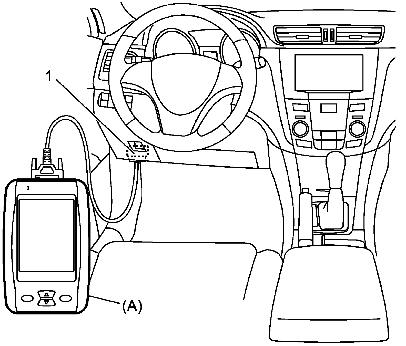 Registered VIN Data Check1. With ignition mode of keyless push start system in "OFF", connect SUZUKI scan tool to DLC (1) located on underside of instrument panel at driver's seat side.