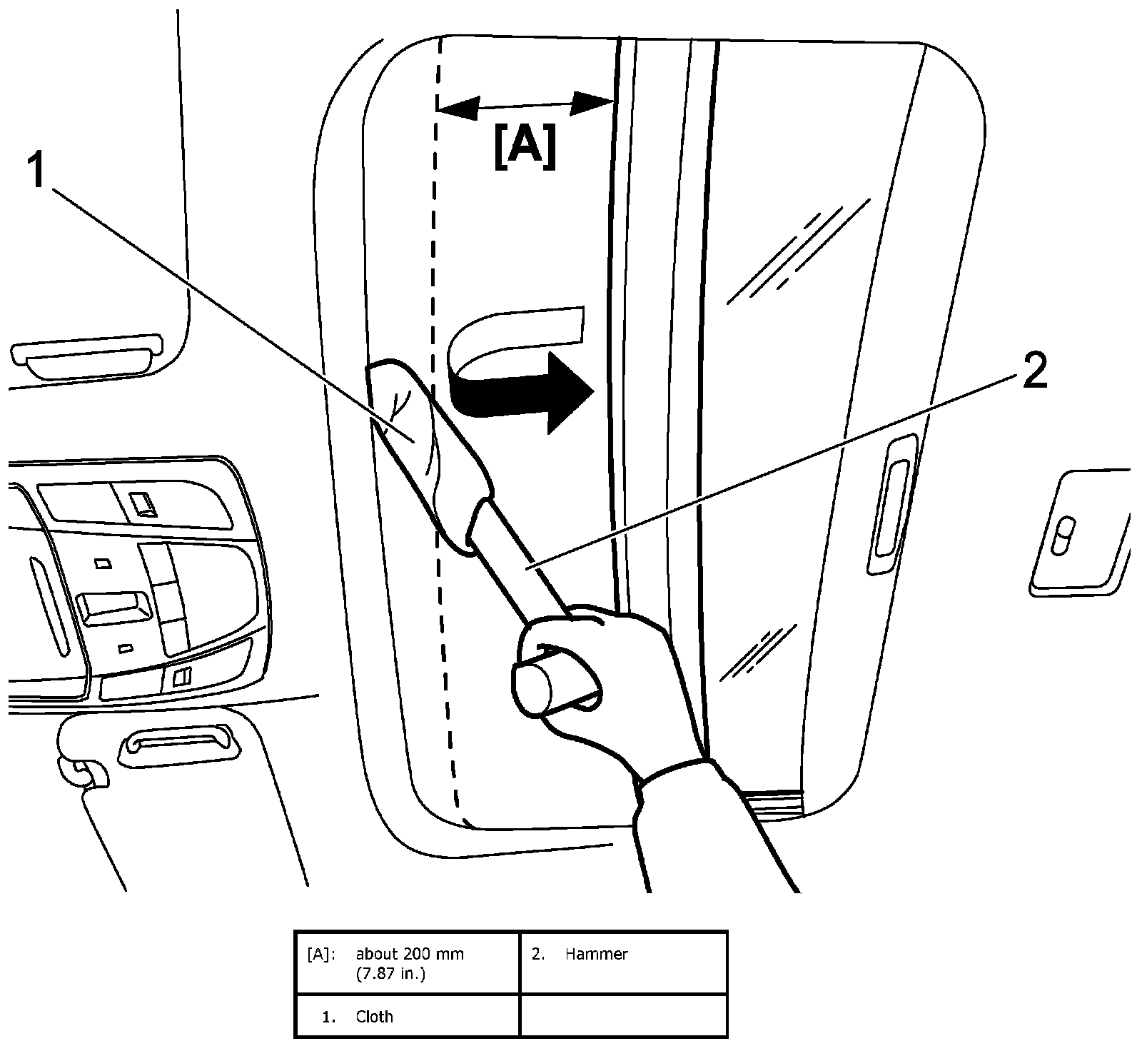 4. Check that sun roof glass reverses (open about 200 mm (7.87 in.)) automatically instead of pinching hammer handle.