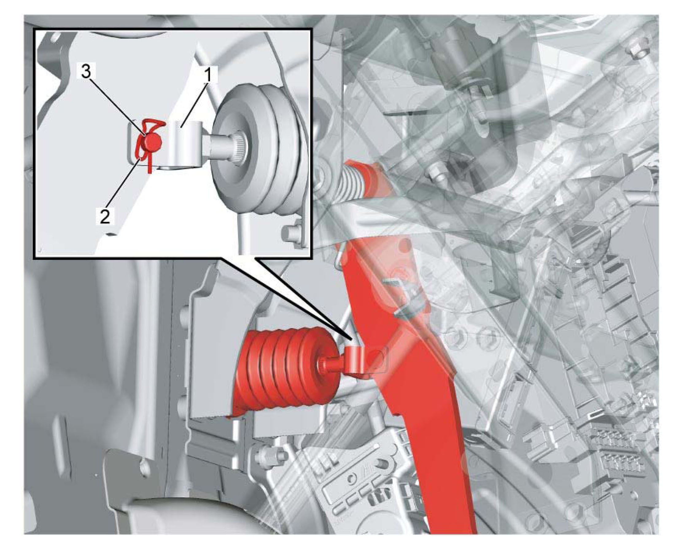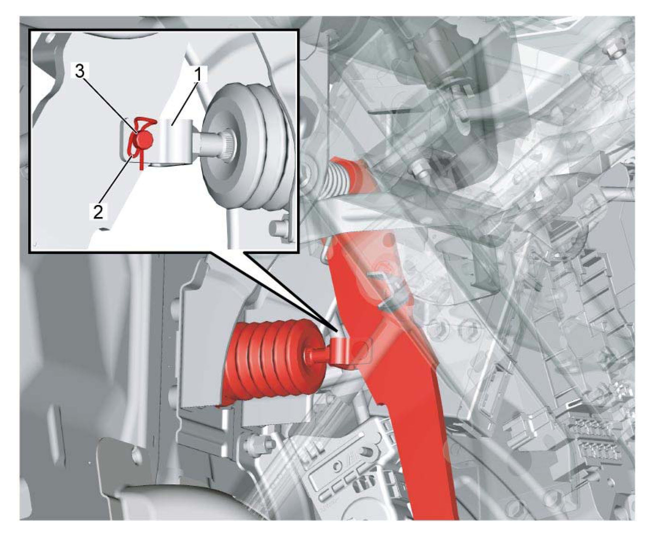 5) Insert clevis pin (3) into hole in pedal and push rod clevis (1) from right side. Then install clip (2).