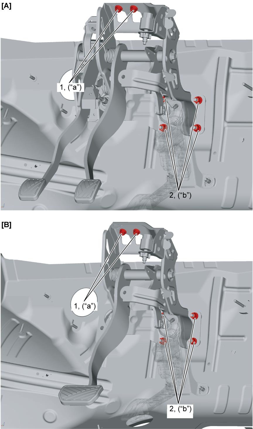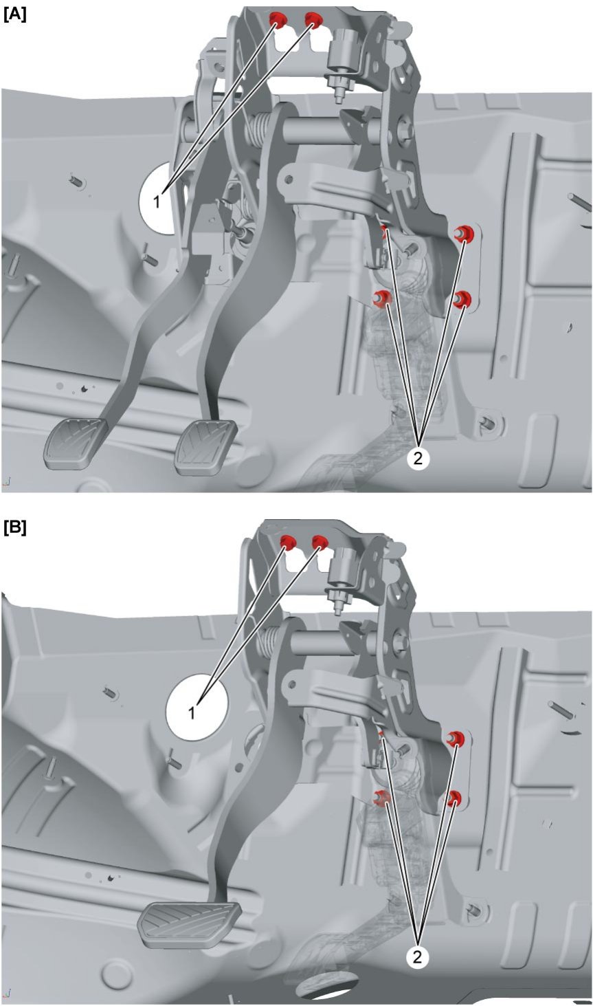 3) For CVT model, tighten brake pedal bracket nut (1) to specified torque.