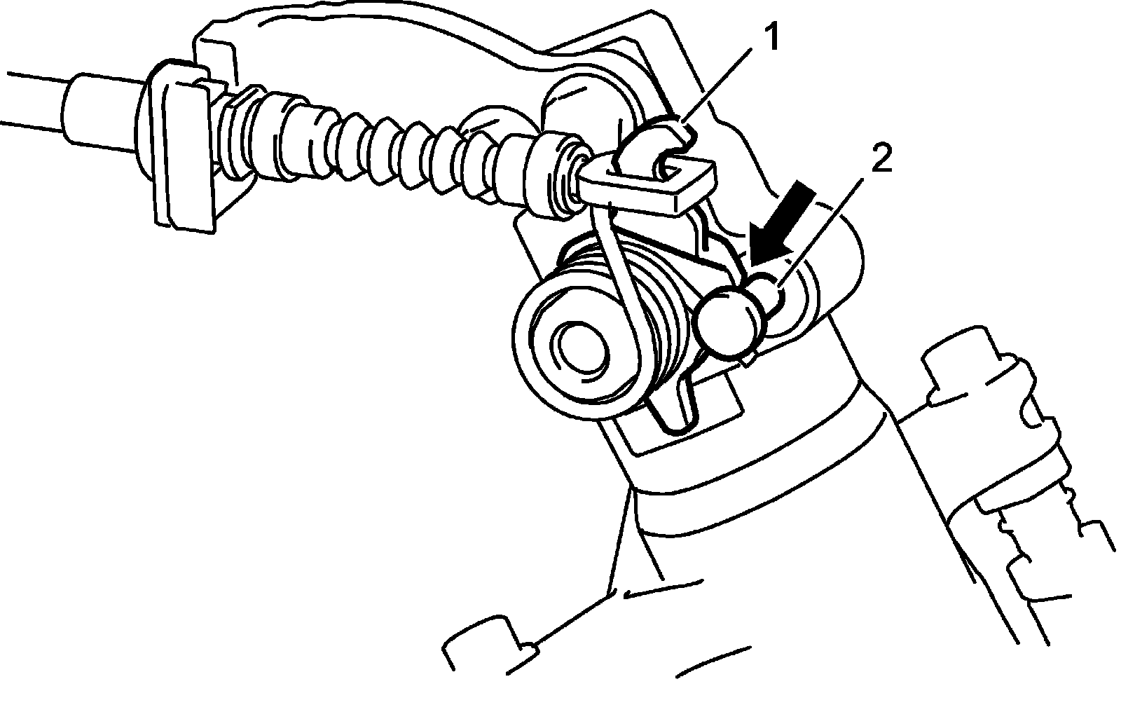 5) Stop engine and make sure that lever of caliper (1) contacts with pin (2). If the caliper does not contact with pin, repeat steps 3) and 4) again.